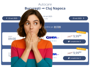 În luna Octombrie, BILETERIA împreaună cu OBADA TRANS oferă 5 bilete pe fiecare cursă București – Cluj Napoca, la doar 9,99 lei, și alte 10 bilete la jumătate de preț.